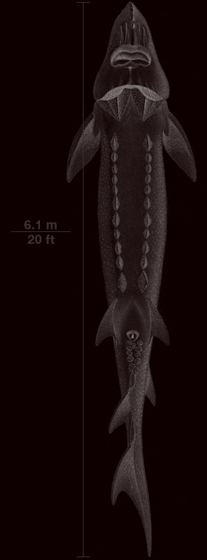 The white sturgeon is a slow-growing and long-lived fish who’s appearance has remained largely unchanged for 175 million years. The body is covered with large bone scutes or plates instead of scales which gives them a somewhat prehistoric appearance. This combined with most specimens commonly growing to the length of a small school bus or longer has made them a highly-sought prize game fish.